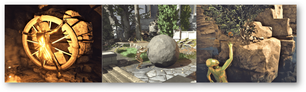 This is something that the game exudes. Consider, for example, the way myths intertwine with daily living experiences of NPCs, and how it is crucial to understanding and finishing some missions (or the game itself). Mythology is not used as a ludo-dynamic interest. On the contrary, the inspiration on mythical contents can be perceived in the structure and content of several missions. Let’s consider the initial “Karen darkness” and how that mysterious beginning gains significance as the story unfolds; or those golden statues of mythical characters peppered across the game’s landscape (Sisyphus pushing the stone, Ixion tied to the wheel, Tantalus picking up the apples at the lake). Eyre told me these were easter eggs by Pearce for classic myths lovers. Nevertheless, they also bring ancient myths as much to characters’ experience as to our reality as gamers, as a suggestion of the human-scale phenomenon behind the myth.