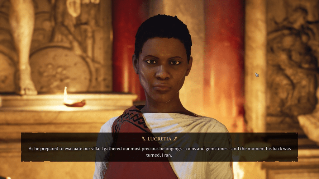 Lucretia is listed as a foreigner, but she has a Roman name, in fact, one that hints at a patrician background. As well as the famous Lucretia (Livy 1.57ff.), Plutarch reports a tradition that Numa married a woman named Lucretia (Life of Numa 21.2). While the name is most famous for its very early patrician branch, there were plebeian branches of the family. At least one branch of the family is attested in the first century CE in a graffito at Pompey which advertises a gladiatorial display put on by Decimus Lucretius Satrius Valens (CIL 4.7995; translation in Cooley and Cooley 2014: 68–69). Lucretia tells the player that “My husband and I moved to Rome from Caesarea. He embraced the Roman way more than I would have liked, and turned into an awful philanderer.” His embracing of Roman ways suggests that he was not culturally Roman to begin with. In Rome they lived in a villa and when the fire struck Rome, her husband was distracted with coins and gemstones, both implying a wealthy background.