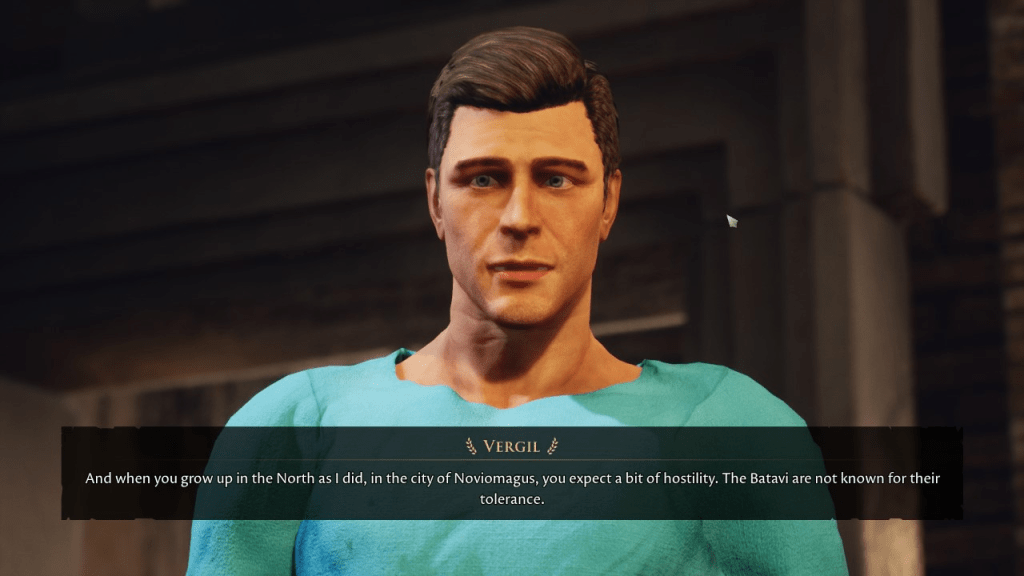 His centring of the Batavians in his story also suggests an origin among that tribe. All of that would lead to the conclusion that he was a peregrinus. However, he is also a well-educated architect who uses the term “barbarian” to refer to the perpetrator of a piece of destructive vandalism. Vergil’s background in the game is difficult to reconcile with a historical trajectory. If his new name were not “assumed” but was the result of patronage and the grant of citizenship (and the name of his patron that came with it), then his background among the Batavians would align more plausibly with a profession that required wealth and connections to obtain.