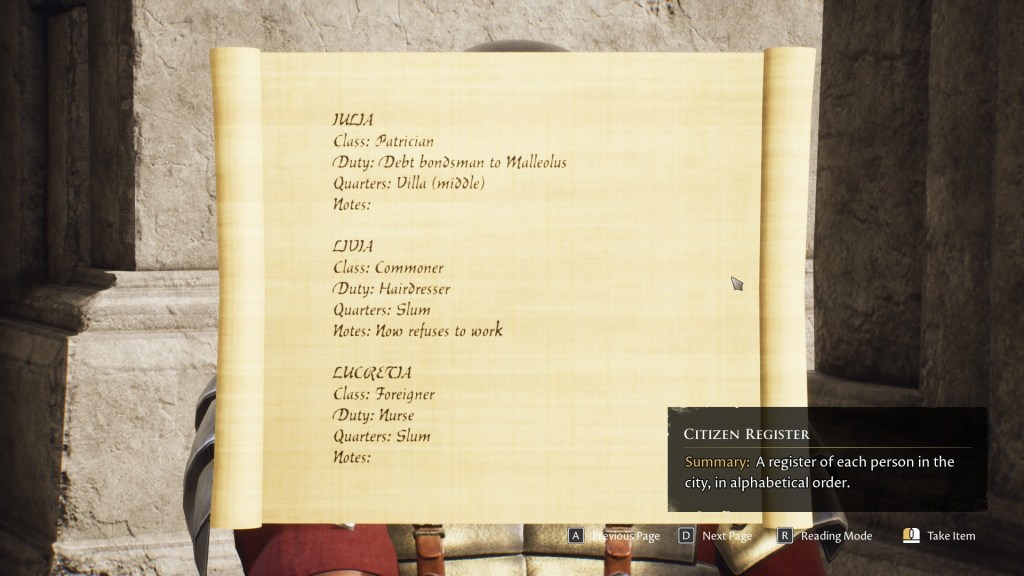 The structure of the society of The Forgotten City is displayed quite clearly in an in-game document called the “Citizen register”. From a gameplay perspective, this provides the player with an overview of the people to find and talk to in unravelling the mystery. At a narrative level, this in-game document describes how each character fits in to the social structure of the city. For each of the 24 characters listed, the register gives a social class, a “duty” (their job), where they live, and for some a diegetic note relevant to the protagonist’s investigation.