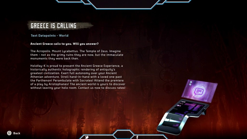 2) Traditional Subversion – Perhaps the strongest critique I have of this game is the state of humanity itself within the gamescape, which implicitly suggests that the only future in which humanity may technologically advance is one inspired by and founded upon Greco-Roman intellectualism. The tribes of Aloy’s world are characterized as primarily hunter-gatherers or scavengers who repurpose some elements of machinery for their daily life, but are largely unaware of Project Zero Dawn’s influence on their world. There is a stark difference between these characters and ones like Aloy or Sylens, who seek to understand the technological marvels of the old world and use this knowledge to bring about great change. At first, most tribes shun those who seek this ‘forbidden’ knowledge, drawing a strong parallel to Plato’s allegory of the cave (Rep. 514a-520a). This low-tech setting is partially used to create a compelling story and robust exploration, but it also illustrates Guerilla Games’ vision of a future where cultures are technologically primitivized due to their lack of classical foundation.2 This particular vision of the future reveals a blind admiration of Greco-Roman culture that exists in the present, even to the point of the game labeling ancient Greece as “antiquity’s greatest civilization.”