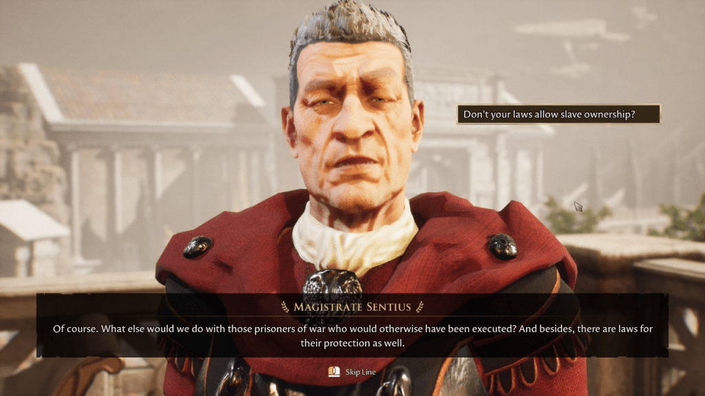 Early in the game, you can ask the city’s magistrate, Sentius: “Don’t your laws allow slave ownership?” To which he will reply: