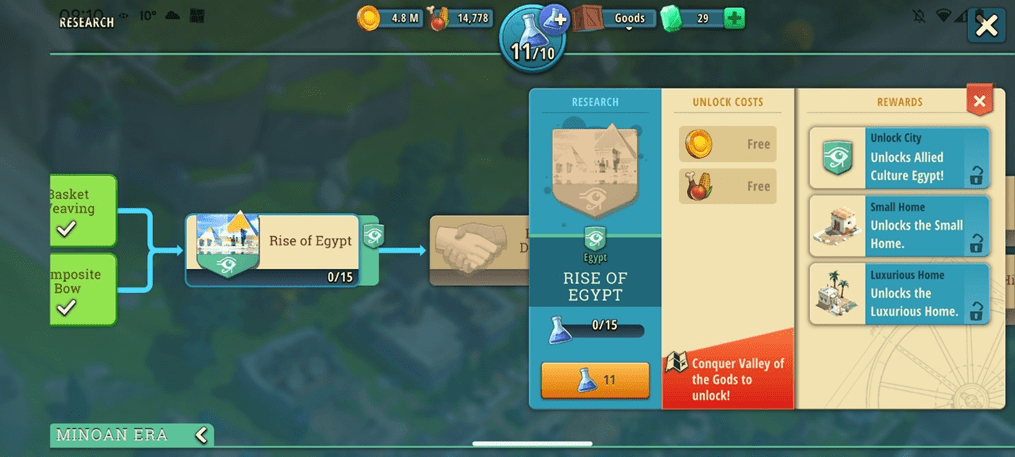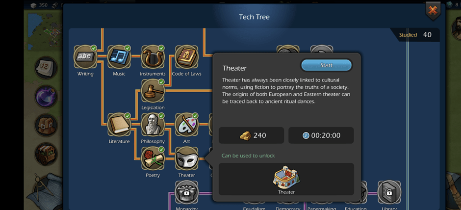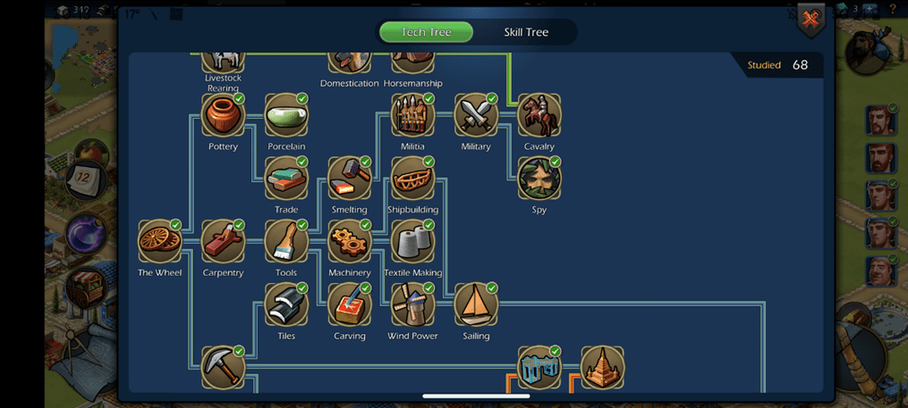 Likely as a result of the similarities with existing historical games, many of the problematic aspects of the representation of history and relations between nations found in other historical games recur in these kinds of mobile games. Use of the tech tree, often criticised for its teleological approach to scientific ‘progress’, is frequent, as in Sim Empire and Rise of Cultures.3 It is also notable that many technologies in this part of the gameplay of Rise of Cultures require conquest to unlock, and to progress along the tree.