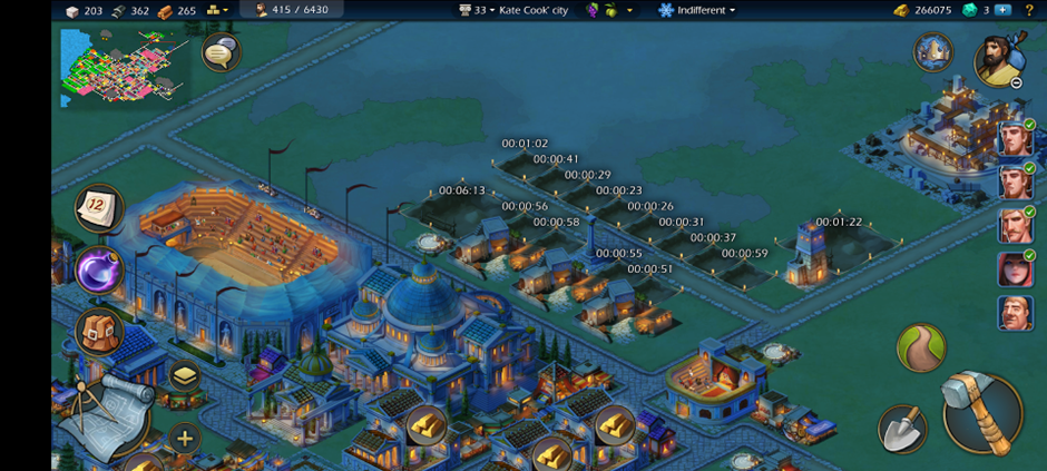 Given the mobile setting of these games, one significant difference in the gameplay mechanics arises, however, in the timing. As with many mobile games, one of the main models of financing is via microtransactions, particularly in the form of paying for speed. Large buildings in later models may take twenty minutes, forty, or multiple hours to build, so players must either dip in and out for short play sessions, or if they want a continuous play session, pay for it. As a result, the relationship between ‘historical time’ and gameplay time is often rather different to that found in other games.5