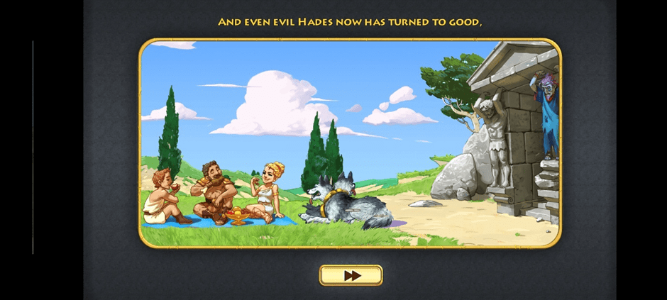 Similarly, the time management series of the 12 Labours of Hercules games (Zoom Out Games, 2013+) feature more or less familiar details such as Hercules’ connections with the Hydra, Cerberus, Heracles’ wife Megara, and his dealing with the Stygian birds, but combine these in the first game with a plot more reminiscent of the Orpheus myth, in which Hercules must rescue his wife from the Underworld. The design of Hades in this game perhaps also indicates the influence of Disney’s (1997) Hercules. The game also finishes by projecting Hades into a role similar to that of Atlas after Hercules’ success (see screenshot below), thus again mixing traditional elements with a relatively casual approach to the myth’s usual features.