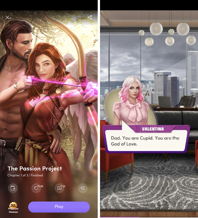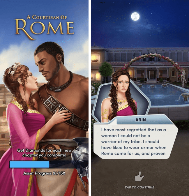 Scripts (another game by IGG, and in many ways the most sexually-focused of these apps) has the story “Love in the Arena”, again set in the Roman Republic, in which you play as the wife of a lanista and find love with a gladiator, and “Cupid in Love”, a story featuring a romance with Cupid in a modern-day setting.