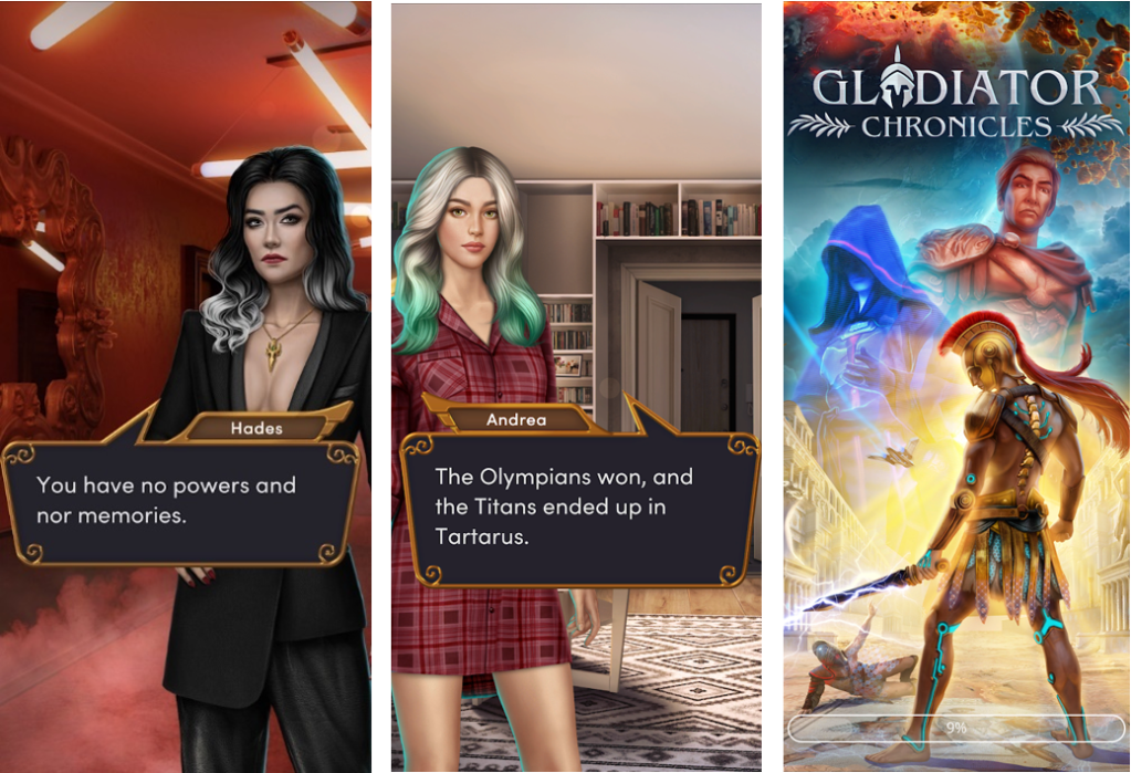 Mobile games also feature a very popular genre of games in the form of the ‘chapter’ stories of Choices (2018, 50M+ downloads from the Google Play Store), Episode (2013, 100M+ downloads), Chapters (2017, 10M+ downloads), Romance Club (2018, 10M+ downloads), Scripts (2020, 1M+ downloads) and many others. These games take the form of a type of interactive graphic novel, with players able to ‘read’ books which have a certain number of chapters, and make choices of dialogue or plot to advance the story in particular directions. Most of these are romance focused (as the name of Romance Club makes explicit). They feature ‘premium choices’ which require the players to spend in-game currency (which can also be purchased as a microtransaction) often either for cosmetic outfits or for special scenes, many of which advance a romantic or sexual relationship with a particular character. A surprising number of these apps feature stories including ancient world material, either historical or mythological.